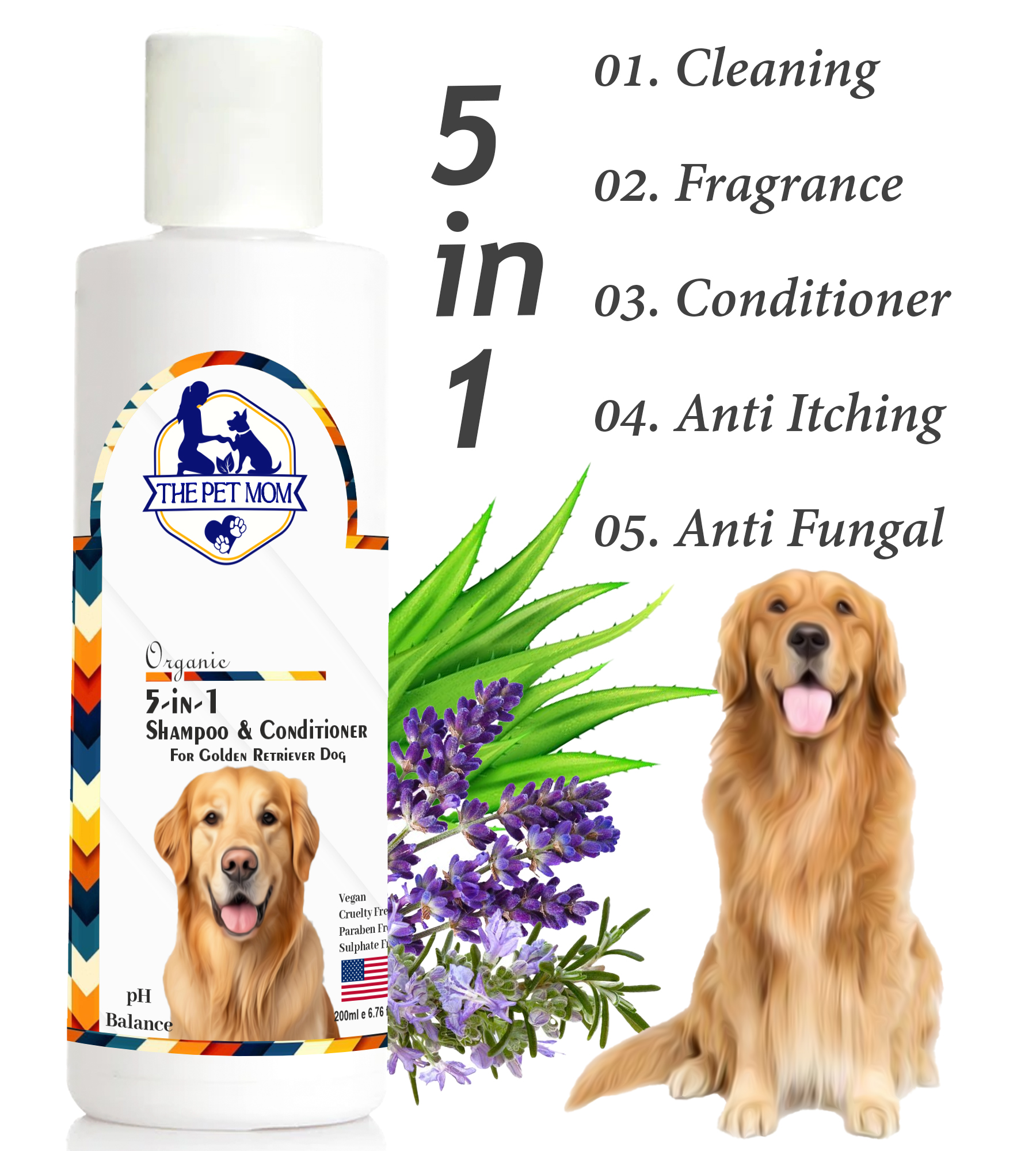 The Pet Mom Organic 5-in-1 Shampoo And Conditioner For Golden Retriever Dog is a refreshing, conditioning, and deep cleansing formula that is loaded with the all-natural goodness of India, Aloe Vera, Lavender, Glycerin, Rosemary Oil, Rosemary Leaf Extract and other beneficial ingredients to offer the care your dog deserves. These ingredients work together to relieve skin irritation, promote a healthy coat, calm skin rashes and let your dog live happily. Not just this, it also replaces bad odor with good odor without stripping off any natural oils and Leaf Extract leaving your golden retriever dog’s coat shiny and smooth.