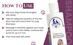 ●Wet your dog’s body thoroughly with water. ●Take an adequate quantity of The Pet Mom Hair Fall Control Shih Tzu Dog Shampoo. ●Massage it smoothly against your Dog’s coat to form a rich lather. Continue the same for up to 5 min. ●Then rinse well with water.